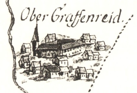 Vesnice se zámeckou budovou na plánu z r. 1629